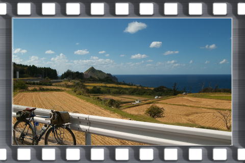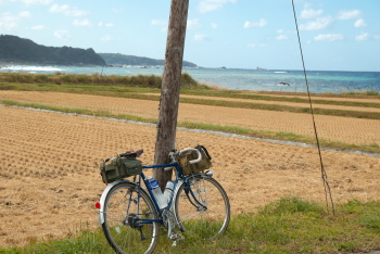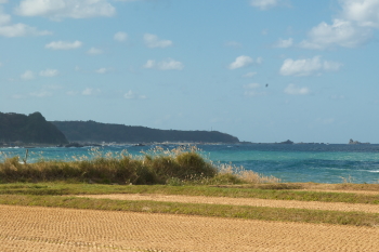 高千の方角を振り返る。海と刈り取り後の田の色、そして空の色が調和していてきれいだった。 |